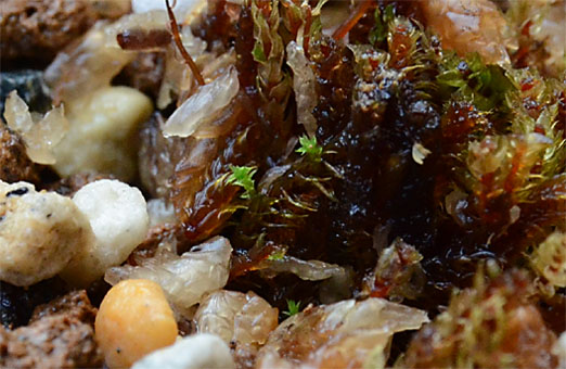 定着に失敗したか・・・と、半ば諦めかけていたスギゴケ(多分・・・^^)が、復活の兆しを見せ始めました。8月中旬に連れ帰って植え付けたものですが、あれよあれよという間に黄変して、枯野の風情を漂わせていました。それでも根気を失わずに水遣りを続けていたのが功を奏したようで、ここに来て緑の新芽が一つ、また一つという風に顔を出し始めました。まだ安心できる段階ではありませんが、4号陶鉢が緑に覆われることを祈りつつ、見守ることにします。