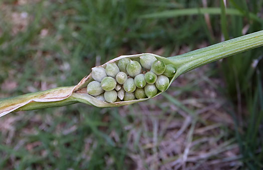 ”猫のヒタイ”ほどの花壇で大暴れしていたカラスビシャク(烏柄杓)にも実りの季節がやって来ました。大量に芽を出した仏炎苞が、ここに来て黄変し始めましたが、お腹に大切に包み込んでいた種子は大きく膨らんで、今にもこぼれ落ちそうな勢いです。 このカラスビシャク、こうした種子とムカゴの両方で増えるため、増殖のペースは半端ではありません。この仏炎苞の親に当る株から2個のムカゴ(株元と葉の付け根)が付き、1個から1芽ほぼ確実に発芽します。加えて、この種子です。発芽率を7割と仮定して、13株ほど増えることになります。1株が1年で15株+自身で、都合16倍に増える勘定になってしまいます。この分なら農業ができそうです ^^;