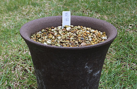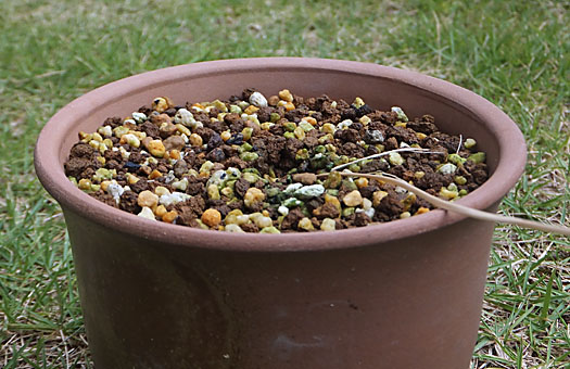 本来ならまだ青々と葉を茂らせている筈のタッタソウ(立田草)が、この暑さのさ中、葉を落として姿を消してしまいました。種蒔きから始めて5年ほど、まだ一度も花を付けていないというのに、とうとう枯れたか?・・と、一時は少なからず気落ちしたものです。しかし、気を取り直して本当に枯れたか、それとも葉を落としただけか、せめて確認だけでもしておこう、ということで、足元を少々掘り返してみました。すると、表土を軽く一掻き、二掻きしただけで健康そうな白いヒゲ根が現れました。どうやら地上部は維持が困難なストレスを受けて姿を消したものの、株としては何とか命をつないだようです。 時期的にはやや早いのですが、足元を掘り返してしまったついでに、この際植替えてしまえ、ということになりました。これまでは6号の素焼き鉢(画像)に植付けていたのですが、鉢自体が水分を蒸発させてしまい、用土の水分維持に骨が折れるという欠点がありました。この際、透水性のない5号陶鉢に植え替えて、来春の芽出しを待つことにしました。