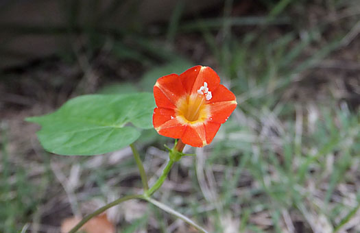 マルバルコウ(丸葉縷紅)が開花しました。昨年と比べて1ヶ月ほど遅れての1番花です。ヒルガオの仲間で、北米からの帰化植物とのことで、農業関係の方々には大変嫌われているようです。規制する法律もあるようですが、直径2cmにも満たない漏斗型の花は可憐で、観賞用としては惹かれるところがあります。 昨年採取した種子は行方不明になってしまい、この個体は芝生にこぼれた種から1株だけ発芽したものです。梅雨が明けた頃、本葉が2-3枚出た時点で発見したのですが、芝刈りを行った際うっかり刈り取ってしまいました。これで我が家のマルバルコウは絶滅か・・・と思っていたのですが、どっこい雑草の生命力の恐ろしさ、とでもいうのでしょうか、1節だけ残っていた葉っぱの付け根から脇芽が伸びて、草丈は20cmほどしかありませんが、一丁前に花を咲かせるまでになりました。この先2-3輪は咲かせようとする意気込みでツボミを準備しています。今年は、採取した種子は保存せずに、その場で採り播きにしようと思います。