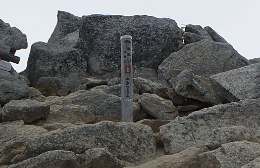 ”赤抜沢ノ頭”に戻って、デポしていたザックを回収して次の観音岳に向かいます。この区間は大雑把に言って高度差100mほど下り、その後200mほど登り返すことになります。コースは花崗岩が風化で粉砕された砂地が大部分を占めます。歩いていて足裏への衝撃は少なくて楽チンなのですが、下り坂で迂闊に砂粒を踏むと足払いを食うことになります。慎重に足を運んでこの区間のアップダウウンを乗り切り、観音岳(2840m 上画像)到着したのは15:30頃でした。標柱は頂から2mほど下がったところに立てられています。背後の岩石の裏側がその位置で、三角点の標識は2個並べて岩石に立て掛けてありました。折り重なる岩場では、穴を掘って並べる訳にもいかなかったのでしょうが、基準点が動くような事態は起きないのでしょうか。 この観音岳が今回の縦走の最高点になるので、後は小さなアップダウウンはあっても、足腰を拷問するようなところはありません。最後の薬師岳へのコースはダラダラと100mほど下って、同じくダラダラと40mほど登るというのどかな丘陵散策です。この頃になるとガスは少し薄まって、眼下には北杜市辺りと思われる町並みや釜無川、中央高速が見渡せるようになっていました。ただ3000m付近は、この時点でも厚いガスに覆われて、北岳や甲斐駒ヶ岳などの雄姿は見られないままでした。 下りも登りも足腰にはそれと分らないような丘陵コースを辿って、この日4つ目のピーク・薬師岳(下画像)に到着。山頂部は緩やかな3つの丘から成り立っており、標柱はその内の1つに立てられていますが、最高点(2780m)は100mほど離れた別の丘にあります。そちらに移動してGPSで測定すると地図上の山頂▲マークとピッタリ一致しました。ならば三角点があるだろう・・と、ピークから半径10mほどの範囲を探し回ってみたのですが、見つけることはできませんでした。これで今回の目標4座は全て巡ったことになります。この後、距離にして2km弱、標高差350mほどをダラダラと下って、この日の宿泊予定の南御室小屋に入り、5:15に1日目の行動にピリオドを打ちました。≪前の記事 次の記事≫