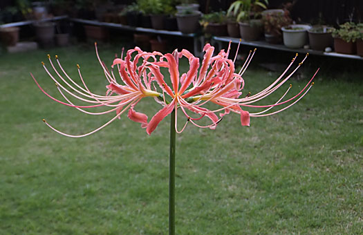 昨日槍ヶ岳から帰ってみると、リコリス1番手が開花していました。動き始めた時点では黄花かピンク花か判定に迷ったものですが、結果はご覧の通りピンク花の「さつま美人」でした。 それにしても花芽が地上に現れてから、こうして開花するまで11日もかかったことなります。これまでの経験的に導き出した日数、6~7日を大きく上回りました。7日遅れて始動した2番手の方は、既に赤花であることが透けて見え始めており、間もなく開花しそうな勢いです。都合よくことが運べば、両者を並べて眺めることができるかもしれません。