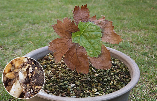 こちらは瀕死の重症ながら、細々と・・・ではありますが命をつないでいるシラネアオイ(白根葵)です。7月には葉の先端が黄変し始め、今では1枚しか発生しなかった本葉の全身に広がる勢いです。ま~、時期的には主要な季節を生き抜いた、と言っても大きな間違いはないのですが、何ぶんにも葉っぱがこんな様子ですから、光合成も十分にはできなかったに違いありません。根に蓄える筈の栄養も足りたかどうか、という点も気になるところです。 で、少しだけ株元を掘ってみると、小さいながら一応来春に備えて越冬芽が用意されていました(円内)。元気そうな白い根も伸びているので、この冬の面倒見に大きなチョンボがなければ、春の芽出しは普通に迎えられそうです。