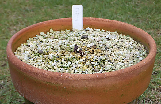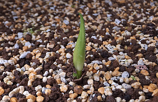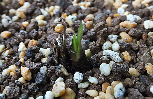 ・・・エラいことが起きてしまいました ・・・・ というフレーズはちょうど3週間前、時期外れのアツモリソウの芽出しが始まって、泡を喰ってこの場に書き込んだものです。その”エラいこと”がまたまた起きてしまいました。 こんどはクロユリ(黒百合)です。普通なら鱗片に包まれてカメのように首を引っ込めている筈の春用の新芽が、表土を押しのけてノコノコと顔を出してしまいました。暑さにも寒さにも弱いこの品種が、このまま開花まで無事に漕ぎ着けるとは考えられず、この子もまた哀れな末路を辿ることになりそうです。 因みに、3週間前のアツモリソウの方は、まだ枯れてはいませんが、草丈は当時と比べて2cmほど伸びただけで、春の場合と比べて全く勢いがありません。草臥れて地に伏すのもそう遠くないと思うと不憫でなりません。