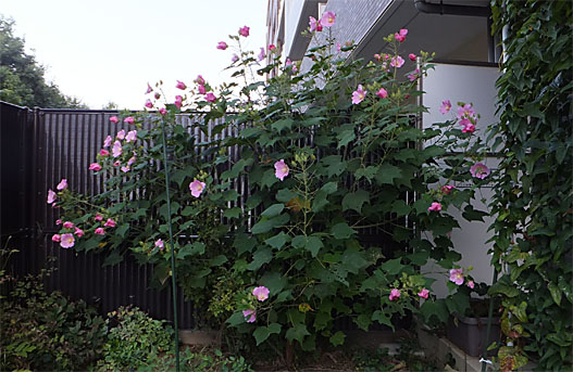 フヨウ(芙蓉)が最盛期を迎えました。ここ数日は毎日30輪ほどが開花しています。画像の色が濃くて萎びたものは昨日咲いたもので、3日目を迎えると花びらはポロっと落ちてしまいます。現在は種子を結ばせないように、開花2日目か3日目には萼弁から先は切り取っています。理由は発芽率の高いこの品種をこれ以上増殖させないためです。 昨年の初冬、幹を1本だけ残して刈り払ったのですが、この春株元から芽を出した”ひこ生え”があっという間に成木化して、3mを越えるような枝振りになってしまいました。こんなことを繰り返していると、やがては隣家にも迷惑が及びそうで、今年の花期が終った時点で完全に伐採することにしました。今年限り・・・と思うと、寂しさがないではありませんが、ジャングル化を避ける意味でも中止はできません。