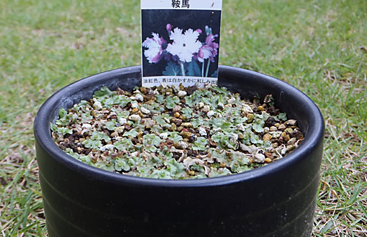 この春花を付けなかった日本サクラソウ「鞍馬」の手入れです。春先には綺麗な表土でしたが、今ではゼニゴケに侵食されてかなり重篤な状況です。この仲間は、夏は地上部は休眠して枯野状態ですが、地中では活発に動いて株別れしているらしく、1年手入れを怠ると翌春にはとんでもない場所から新芽が出て来たりします。で今回は、(1)新芽が端に寄っている場合は中心寄りに植え替え、(2)用土が疲労している場合は総入れ替えを行うことにします。 表土を覆ってしまったゼニゴケは、表土ごと1~1.5cmゴソッと剥がしてしまいます。これだけ表土を剥がすとサクラソウの根は露出してしまいます。左の白い方が今年発生した新株の根、やや赤みを帯びている方がこの春芽を出していたものです。偶然ですが、新株が広く空いていた方に発生したため、新旧合わせ技でちょうどバランスのいい配置になっていました。用土についても、赤玉土の微塵化が少し認められますが、まだまだ使えそうです。ということで、減ってしまった表土の分だけ新しい用土を補充して、本品の今年の手入れは完了・・・ということにしました。