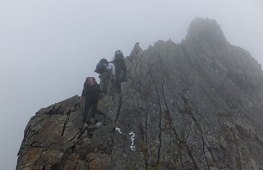 行って来ました、西穂縦走弾丸ツアー。結果はVサイン!でした。西穂山荘から穂高岳山荘までの今回の所要時間は9時間35分(休憩込み)、前回と比べて20%短縮できました。登山マップによると、コースタイムは10時間(休憩抜き)なので、平均以上の”歩き込み”ができたということになります。予定を上回って早く穂高岳山荘に到着したので、ここでの宿泊はヤメにして、そのまま白出(しらだし)沢を通って下山してしまいました。そんな訳で、朝4時から夕方7時までほぼ歩き詰めだったため、いつもは直帰できるところを、途中で3時間ほど仮眠をとったため、帰宅は朝6時になってしまいました。 画像は縦走路の最終局面、奥穂高岳直下の”馬の背”と呼ばれる難所で幅50cmほどの岩石の上を辿るところです。足の下は左右とも200~300mほどの絶壁で、こんな天空の細道(?)が50mほど続きます。晴れていれば極限の高度感を味わえるスポットなのですが、生憎この日はガスに巻かれて10m前後までしか見通せず、恐怖感は全くありませんでした。≪前の記事 次の記事≫