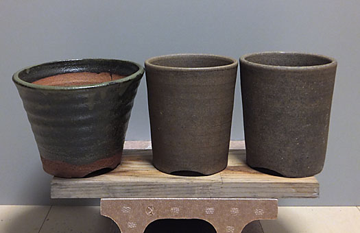 そろそろ秋の手入れの適期を迎えます。休眠中のもの数点は既に処理を終えてしまいましたが、残りは数10点、長い秋になりそうです。この内、何点かは草丈が現状に鉢にそぐわない程度に成長してしまいました。という訳で、一回り大きな陶鉢を探しに信楽に足を伸ばしました。残念なことにお気に入りの仕様のものは既に生産終了となっていて、手に入れることができませんでした。画像は代替品として調達して来たもので、3.5号と5号サイズのものです。 信楽に出掛けると必ず立ち寄りたくなるのが山野草店でして、フラッと店に入ったのが運の尽き、今回も衝動的に苗3点を連れ帰ってしまいました。合計1890円也。この中には秋咲きの品種も含んでいるので、後日紹介できるかと思います。