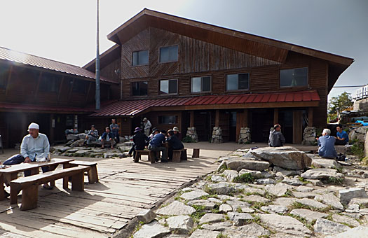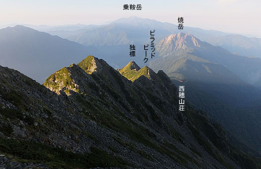 今回の山行の”キモ”は、西穂高岳と奥穂高岳の間の岩峰歩きなので、いつものように登山口から登山口まで、全て”my脚&足”だけで踏破する行動スタイルは放棄しました。で、新穂高温泉からの入山の取っ掛かりはロープウエーを使って、一気に標高2160mの西穂高口駅まで掛け上がります。ここまで来ると、天気さえ良ければ樹間に山荘を望むことができます。ここから先は登山装備なしの客は侵入禁止というアナウンスが流されています。稜線上の山荘までは、前半は穏やかな起伏の山道ですが、後半は一気に勾配も急になります。高度差200mに所要時間1時間余りかかって、1日目宿泊先の西穂山荘(上画像=標高2366m)に着きました。 山荘で宿泊手続きを済ませ通された部屋は8畳の部屋で、混雑時には18名収容という部屋に、この日は5人の客が割り当てられました。山荘の計らいか、相部屋となった5人は全員同じ縦走を目指す客でした。その日は、互いの山の経験などの話で盛り上がりましたが、翌朝は3時頃起床、4時頃出発ということでタイミングを合わせて、8時には眠りにつきました。 さて、本番の朝です。3時少し前に誰かがトイレに立ったのを契機に、全員起き上がって準備に取り掛かりました。寝具を片付け部屋を出て、素泊まり客の自炊のために解放されたレストランで軽く朝食を済ませて、相部屋となった5人揃って3:53に出発しました。上空には高層の薄い雲がかかっていて星は僅かしか見えませんが、この手の雲は日中には消えるものです。 真っ暗な中での出発なので、全員ヘッドランプを点けての”ちょうちん行列”になります。のっけから急勾配のコースですが、それでも二足歩行が可能な勾配です。前方にも後方にも、別のパーティのライトが点々と続いて、季節外れのホタルの行列のような眺めです。呼吸は乱れますが、5人が塊りになって歩くこと1時間余りで、最初のチェックポイント・西穂独標(下画像)に着きました。この頃、空は僅かに白み始めていましたが、まだランプなしで歩ける状況ではありません。それでも目を凝らせば進行方向右手に奥穂高岳や前穂高岳、左前方に笠ヶ岳のシルエットが確認できます。≪前の記事 次の記事≫