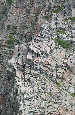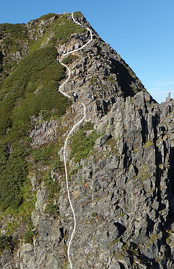 3年前アタックして、手荒い(?)洗礼を受けた西穂縦走にもう一度トライすることにしました。画像はその時の様子で、私とは逆に進むパーティが天狗岳の壁を下降する様子を写したものです。画像中央部の岩場が「逆層スラブ」と呼ばれている難所で、オーバーハングになった岩場に設えられた鎖に掴まって、腕力頼りで登ったり下ったりしなくてはいけません。 その時は直線距離で僅か4kmの西穂山荘と穂高岳山荘の間を通り抜けるのに、12時間もの時間を費やしてしまいました。今回は、何とか10%程度短縮して、10時間台で通り抜けたいと思っているのですが、さて、どんな結果になりますやら・・・ それでは今から行って来ます。 次の記事≫