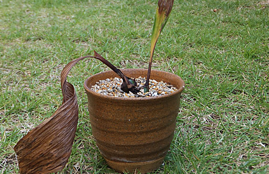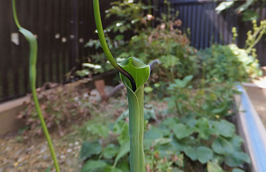 カラスビシャク(烏柄杓)の花が最盛期を迎えたようです。といってもハシリの開花は5月上旬で、その後クライマックスのないドラマのようにダラダラと少数が咲き続けていました。同時にムカゴを実らせ、ばら撒いたムカゴからも発芽して、小さな花壇はカラズビシャクだらけ、といった様相です。ここに来て10数本が一斉に顔を見せて、遅れ馳せながら・・の山場に差し掛かったような眺めです。 お気楽に”花”だの”開花”だのと表現してしまいましたが、正しくはマムシグサやミズバショウと同じ”仏炎苞”と呼ぶのが正しい表現です。仏炎苞の大きさは、太さ0.5~1cm、長さ4~8cmぐらいで、実際の花はこの仏炎苞の下部に厳重に(?)包まれています。上部の開口部から長さ5~8cmのヒモ状のものが伸び出していますが、この様子がミニサイズのウラシマソウのような形をしているところが気に入って、我が家に連れ帰りました。この草の塊根(芋)は漢方薬の「半夏」として利用されるそうですが、我が家ではそのような利用計画はありません。
