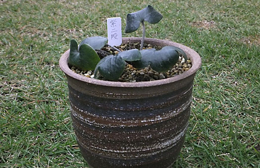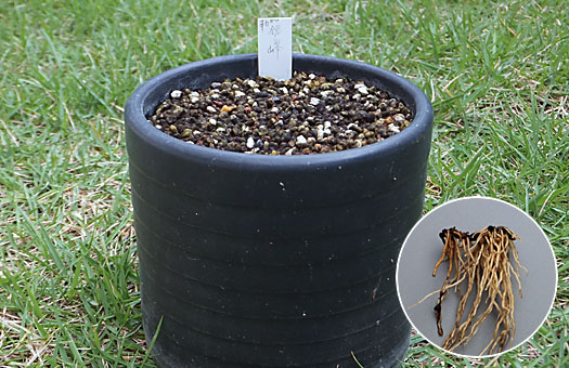 今回はシラネアオイ(No.2)の健康診断を兼ねた植え替えです。春の芽出しの頃から軟弱で、入梅の頃には葉を落として姿を消していました。その隙にこぼれ種から発芽したカナダオダマキが、主の休眠中をいいことに、大きな顔をしてのさばるようになってしまいました。このエイリアン(?)は駆除・・・という判決です。 主は生存中ということを前提に慎重に用土を崩して行くと、ジリ貧ながらも何とか生き延びていました(円内)。次の春に向けて些少ですが越冬芽も用意してあります。用土の疲労はさほど進行してはいませんでしたが、住人の勢力復活を期する意味で、全面的に新しいものに入れ替えることにしました。いつものように常用の配合比の用土に、固形培養土適量と化成肥料少量を混ぜたもので埋め戻して完~成ということにしました。この塊根のサイズでは来春いきなり「お花見」という訳にはいきそうにありません。来年1年はリハビリ期間と覚悟して、体力回復に当らせることにします。目標は、せめて盛夏を過ぎるまで葉や茎が生き延びられるよう、それに見合う地力を付けさせることです。