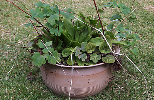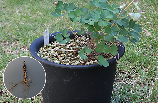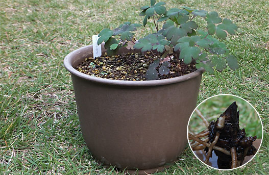 このポットには一昨年シャクヤク(芍薬)の種子を植え付け、昨年春1芽だけ発芽しました。少し遅れてカナダオダマキのこぼれ種も発芽したのですが、今では軒先を借したカナダオダマキの方が主人面をするようになってしまいました。今回はこのポットで人質同然になって片隅に追いやられてしまったシャクヤクの救出と、部外者のカナダオダマキを追放することにします(と言っても、露地に移植するだけですけど ^^)。 慎重に用土を崩して行くと、実生2年目のシャクヤクが見つかりました(円内)。部外者の日陰になって早々と姿を消していましたが、地中の根は何とか生き延びていたようですが、発育は遅れ気味です。ポットはもう1期間(2年程度)このまま我慢して貰うことにして、しっかりと洗浄した後、新しい用土に化成肥料を心持ち多めに混ぜて植え戻しました。開花可能な成熟株になるまで少なく見積もってもまだ5年、それまで生き伸びられるかどうか自信はありませんが、しっかり見守ってやろうと思います。