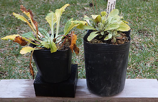 今年も夏の暑さを凌ぎ切れず、姿を消したものがたくさん出てしまいました。この時期は秋の手入れと共に、欠員補充の時期でもあります。ということで、今回は第1次補充として札幌の業者さんから調達しました。画像の2点はいずれもサクラソウの仲間で、左はネムロコザクラ(根室小桜)、右はプリムラ・マルギナータです。この他に種子2点も同時に調達しました。 当日中に全てを定植はできませんでしたが、取り敢えず1点、ネムロコザクラのみを定植しました。塩ビポット内はかなり根が回っていましたが丁寧に解して、常用の用土で4号陶鉢に植え付けました。何とか無事に定着しますように・・・・ 残りの苗と、種子2点は今日中に処理するつもりです。