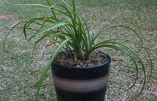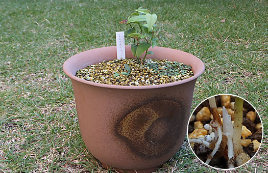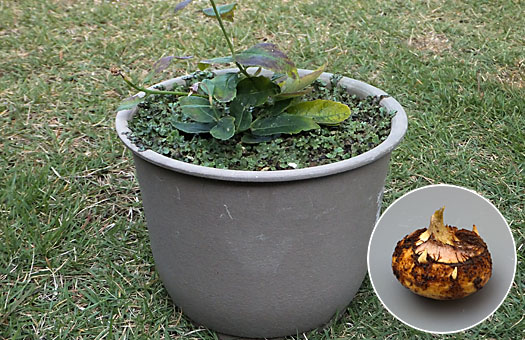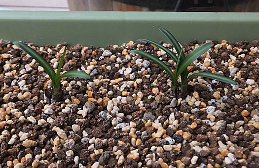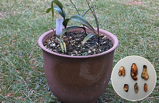 今回はウチョウラン(羽蝶蘭)の植え替えです。去年植え替えたばかりなので、妥協すればゼニゴケの幼生で黒く変色した表土を交換するだけで、もう1年辛抱させてもいいのですが、球根(バルブ)の様子も確認したいので、大盤振る舞いで植え替えることにしました。去年秋には球根は6個ありましたが、春になっても5株しか芽出ししませんでした。今回掘り出してみると、6球を回復していました(円内)。この内、上段の3個は無事に夏越しできれば・・・の話ですが、分球しそうです。家族が増える(かも知れない)というのは、嬉しいものです。 元の5号陶鉢をきれいに洗浄し、ウチョウラン専用の用土に少量の固形培養土と化成肥料一つまみを混ぜたもので植え戻しました。冬の冷え込みには割合強い方なので、春の芽出しや花期は心配する必要はないと思うのですが、問題はやはり夏越し・・・ だな。