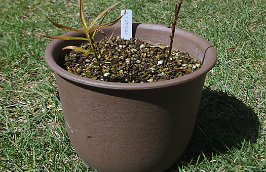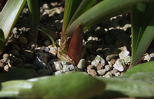 原種ネリネ(Nerine.undulate)が開花期を迎える前に植え替えようか・・・と、プランタを引っ張り出したところ、何と花芽が顔を出しているではありませんか。これでは今植替えを強行すると、軟弱な花芽を損傷してしまいかねません。ということでやむなく(実は、これ幸い・・・かも)秋の手入れは見送ることにしました。花後の1-2月、土いじりや水仕事を一番したくない時期にやり直すことになるかもしれません。 この花、南アフリカ原産でヒガンバナの仲間ということですが、12月から1月にかけて咲くことで、殺風景な冬枯れの我が家のベレンダに、一時的ですが華やぎをもたらしてくれる貴重な存在です。この状態の花芽が開花するまで、過去の例では3週間から4週間かかっています。今年は早ければ11/20前後の開花になるかと思いますが、株の太さなどから推測すると、今年はそこそこ豊作になるかも・・・などと、捕らぬタヌキが太り始めています。