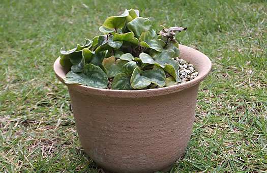 今回はトキワホウチャクソウ(常盤宝鐸草)の植え替えです。この品種は昨年冬購入してこのポットに定植したもので、ものぐさ園芸家としてはこのままでもう1年我慢して欲しいところなのですが、今年の芽出しがポットの端に偏り過ぎてしまったことで、この際中心寄りに移動させることを目的に植え替えることにしました。 株を掘り出してみると、親株に引けをとらないサイズの越冬芽が用意されていました。これなら来春花を付けるのは高望みし過ぎとしても、今より大柄の株は期待できそうです。常用の用土に固形培養土を適量配合し、化成肥料も少量加えて植え戻して、一丁上がり・・・としました。