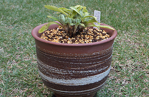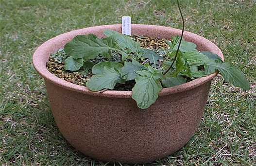 一昨日残した作業の続きです。プリムラ・マルギナータの定植と種子2点の種を蒔くことにします。プリムラの方は黄変した葉を切除して、現時点で元気そうな葉だけを残しました。あと1ヶ月もしない内に全て枯れるのですが、ま、その辺は気休めですが暫く残すことにしました。新居は5号の陶鉢で、深さはこれまでと大差ありませんが、面積は2倍以上になります。常用の配合比の用土に固形培養土少々と化成肥料をを一つまみ混ぜて植え付けました。出来上がった様子は、首がやたら長いように見えますが、これでも塩ビポットの時より1cmほど深く植付けています。この次の植え替えの際には、もっと深いポットに切り替えて、もう一息深く植える必要に迫られるかもしれません。 もう一つの種蒔きの方は、用土を篩にかけて一回り小粒のものを選別して使用しました。配合比率は同じで、肥料はこの時点では混ぜていません。種子は数えてみると2点とも10粒ちょうど入っていました。3.5号の塩ビポットに適当に散らせて蒔き、軽く覆土して一丁上がりとしました。