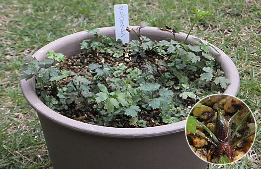 今回は足回りをびっしりとゼニゴケに絡みとられた、セリバオウレン(芹葉黄連)の救出です。表土はコケの幼生で真っ黒に変色してしまいましたが、梅雨の頃真新しいものを用意して種蒔きポットから移植したものなので、用土そのものはさほど劣化はしていないだろう・・・ということで、コケの駆除とこれに伴って減少する分だけ新しい用土を補充することにします。 今年発芽したばかりの若芽なので、ヒゲ根を痛めないよう慎重に作業を進めます。それでも仮根を含めて1cm余りがゴソッと剥がれると、住人ごと抜けはしないかとハラハラさせられます。こうした作業の中で、今まで気が付かなかったのですが、大きな(と言っても米粒より少し大きい程度 ^^)越冬芽が用意されていました。発芽から1年で花を付けることはないだろう、と期待もしていなかったのですが、ひょっとすると来春にいいことが起きるかもしれません。実現するかどうかは不確かですが、淡い期待を抱きながら新しい用土と肥料を施して作業を終了しました。