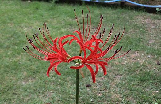 リコリス(彼岸花)2番手が開花しました。花の色は動き始めた時点で予想した通り、ごく普通の赤花(Lycoris radiata)でした。後続の花はどうか、ということで、プランタの隅々まで目を凝らしているのですが、今のところ、その兆しはありません。昨年分球が多かったことの影響かもしれませんが、今年の作柄は大きな期待はできないかもしれません。 一時は最悪の場合、台風17号の直撃もありそうな予報が出されていました。そんなことになれば軟弱なこの花は一溜りもなかったに違いありません。幸いなことに台風が少し東にそれたことで、暴風圏の最外周がかすめた程度で済みました。一夜明けて、先ほど懐中電灯を取り出して確認したところ、花も花軸も無事なことが確認できました。この地域の野辺の彼岸花もほぼ咲き揃う頃です。被害が少なければいいのですが・・・。
