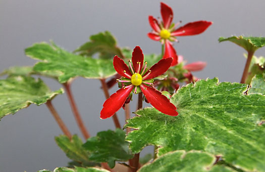 大文字草が開花しました。この個体には「天輝」という銘が付いています。この花のルーツに当る花は、先般の黒部峡谷・下の廊下を徘徊した際、標高1000m前後の岩場でたくさん見掛けました。私が徘徊する範囲内では、自然界で見られるのは白花だけですが、園芸種としては実に多様な色や弁の形状のものが出回っています。購入に当り参考にしたカタログ画像では、もっと暗い赤だったのが気に入って購入を決めたのですが、いざ開花してみると赤が鮮やか過ぎて、正直な話少々ガッカリ・・・といった気分がないでもありません。ハズレ・・とは言え我が家に興し入れした以上、この先は長~いお付き合いをして行くことになります。 この品種はユキノシタの仲間ということなのですが、生命力という点では遠く及びません。過去にの何度か類似品を購入したことがありますが、なかなか夏越しできず姿を消してしまい、新顔のこの子以外は1点も残っていません。夏越しという、初歩中の初歩が課題と言う、いささか情けないところからのスタートになりますが、次の秋にもこの花が見られるよう頑張ってみることにします。