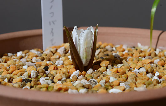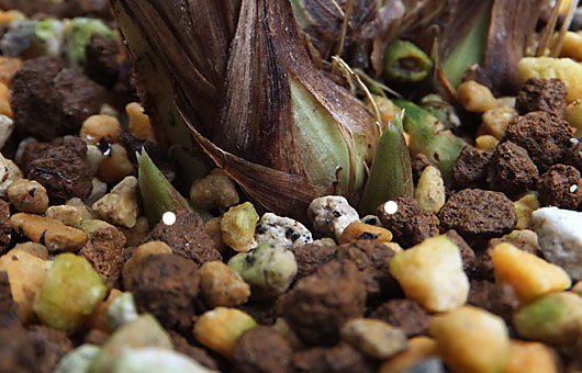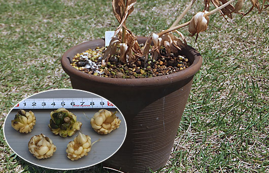古い画像で恐縮ですが、上は2月末に開花したコシノコバイモ(越ノ小貝母)の様子です。本来なら地上5~10cmで釣鐘型の花弁を水平、若しくはやや下向きに咲く筈なのですが、地表に晒し首を置いたような格好で開花してしまいました。花そのものは、色も形も至って標準的な仕上がり具合で、これと言った欠陥はありせん。ただただ、花の位置だけが問題でした。 なぜこんな不恰好な咲き方になったか、あれやこれやと理由を考えてみました。決定的なことは分かりませんが、球根の位置が深すぎて花芽が伸びて地表に到達するのに時間がかかり過ぎ、その間にツボミが成長してしまうのでは?・・という仮説を立ててみました。で、時期としては芳しくありませんが、この際一度球根を掘り出して、ついでに植え替えてしまおう・・ということで作業を強行してしまいました。 下画像が球根の様子(before)ですが、用土表面から2.8cmの位置に球根が埋まっていました。パチンコ玉ぐらいの球根にしてはやや深過ぎのような気がします。で、新しい用土を用意して、球根の頭が1.3~1.5cmになるように慎重に植え直しました。因みにコシノコバイモは2鉢に2株保有しており、もう一方も掘り出して、上記の鉢に合わせて植え付けました。球根の身になってみれば、こんな時期に転居させられて余計なストレスになったかと思いますが、何とか機嫌を直して、来年には容姿端麗な姿を取り戻して貰いたいものです。