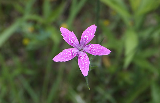 この頃「行きつけの○○」というCMがよく流れています。画像はその「行きつけの草むら」に隣接した側溝の、コンクリートとアスファルトの僅かな隙間に根を下ろした雑草に咲いた花です。この頃の草地は白系の花が多数派を占める中で、直径1.5cmほどの鮮やかなピンクに白い斑点を散らしたものが、やたらに目立ちました。草丈は周囲の雑草どもと背比べをするかのように目一杯背伸びしたためか、60cmほどもあります。早速画像はGETしたものの、ナデシコの仲間らしいことは分かりましたが、正式名前は皆目見当がつきません。で、困った時の行きつけの”名前を教えて!”掲示板に尋ねてみました。 いくつか不手際があって、画像を貼らずに投稿したり・・・という、お粗末な失敗はありましたが、訂正後15分ほどで回答を頂戴しました。名称は「ノハラナデシコ(野原撫子)」でした。自宅の花壇でも栽培してみたいような艶やかな容姿ではありますが、僅かなアスファルトの隙間でも繁茂して行ける生命力を見ると、肥料タップリの花壇に籍を置こうものなら、短期間に他を脅かす存在になりそうです。そんな訳で、お輿入れは遠慮願って、逢いたくなったらこちらから足を運ぶことにしました。