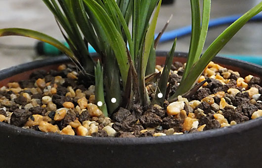 中国産や園芸種と比べて遅れていた、一般種のシュンラン(春蘭)にも新子が顔を見せました(○印)。画像のポットの株は老化が甚だしく、4個のバルブのうち2個は葉っぱを全て失って、枯れるのを待つだけの状態になっています。当然後継者を再生産する能力は残っていません。壮年期の株は2芽だけになっていたので、今回の新子2芽で従来の勢力を回復する見込みが立ちました。まずはメデタシ!というところです。 この春には多数の花芽を立ち上げ、長い間花を楽しむことができました。その時点では株立ちの規模が大きくなり過ぎたきらいがあったため、花後2つに株分けしていました。分割したもう一方にも1芽の新子が確認できました。問題は枯れるのを待つだけの老化バルブを抱えた画像のポットで、この春植え替えたばかりというのに、花芽が顔を出す9月までに再度植替えが必要になりかけています。時期は適当とは言えませんが、新子がある程度伸びて安定した頃に実行することにします。