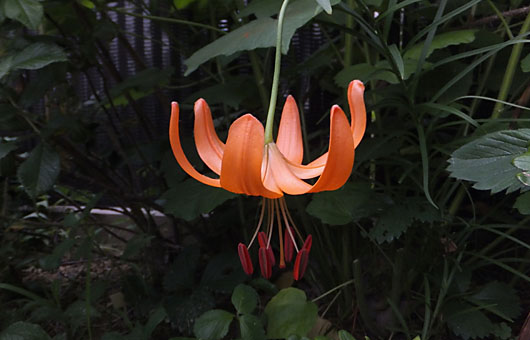 原種ユリ、リリウム・ダビディーが開花しました。一時は小さな花壇を席巻しそうな勢いだったのですが、流石に旺盛な繁殖力も樹木の勢いには勝てず、敗退の道に追い込まれてしまい、今年はこの1輪だけに終わりそうです。 昨年までほぼ同じ場所にフヨウを植えていました。それが2mを大きく上回る高さに繁茂し、原種ユリは日陰の身となってしまいました。それまで分球で仲間を増やしていたユリも、この”日陰攻撃”は応えたようで、一時は10数株確認できたものが、今年は消え入りそうなひ弱な株が4-5株確認できるだけです。フヨウは完全に駆除することにしたのですが、ひこばえがソロリと立ち上がっており、元に戻そうとしています。このひこばえを1芽残らず駆除し続ければ、いずれは絶滅につながる筈なのですが、長期戦は覚悟しなくてはなりません。こうして日差しを確保してやりさえすれば、ユリは元の勢いを取り戻すことだろうと思います。何はともあれ、「原種」と名の付く品種の全滅は回避しなくてはなりません。