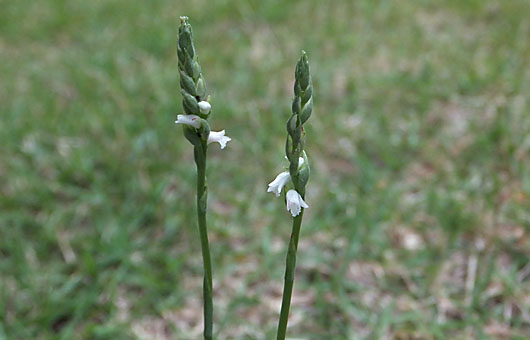 路地もののネジバナ(捩花)が咲き始めました。芝生に根を下ろしたものですが、まだ花芽も発生していないプランタものを尻目に早々と開花です。予想外のことですが、路地もの1番花は白花でした。とは言いながら、時間が経つと赤みを帯びて来るものもあるので、今の段階では大袈裟にはしゃぐのはやめておきます。 5坪あるかないかの半端な芝生ですが、隅々まで点検してみると合わせて4株のネジバナが見つかりました。多分プランタで栽培しているものが起源だろうとは思いますが、全て家主の思惑の外で自然に芽吹いたものです。うち3株は今年花を咲かせる気満々(?)で、花芽を立ち上げています。公園などの芝生の一角で、この花(普通は赤花ですが・・・)が高密度に生えているのを見掛けたことがありますが、我が家もそうなって欲しいものです。副作用として、芝刈りは甚だ面倒になりますが、その点はネジバナサポーターとして我慢する覚悟はあります。