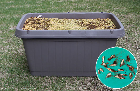 今年も作落ちに近い出来栄えだったカタクリ(片栗)ですが、プランタのサイズは45×30×25cmとかなり大きめのものを選択していました。この野草の球根が地中深くもぐり込む特性があり、好きなだけ自由に潜らせようという親心(?)が導いた結果でした。これが裏目に出て、台風の接近などで緊急避難させる場合、その重量で腰を痛めそうになることも少なくありませんでした。今回は保護者の腰を守ることを主な目的に、少しだけ小型のプランタに植え替えることにしました。 新しいプランタは30×30×25cm、物流用途などに使用されるものです。底に水抜き穴を開け、用土が漏れないようネットを貼り付けています。上画像の円内は掘り上げた球根で、昨年植え替えた時より個数で4割ほど減ってしまいました。大きく重い分、細かな養生ができなかったことで、休眠中の夏場に乾燥や温度上昇で枯死したのかもしれません。原因はさておいて、プランタの面積も3割ほど減るので、密度は同程度ということになります。用土は昨年植付け時に混ぜ込んだ腐葉土がちょうどいい具合に分解したところなので、そのまま使うことにして、新居に移したのが下画像です。これで潅水直後でたっぷり水を含んでも、何とか持ち上げられる重量になりました。