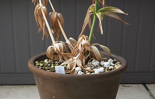 夏休眠型の草花の殿(しんがり)として、クロユリ(黒百合)が眠りに就きました。早春に花を楽しませてくれたスプリング・エフェメラルと総称される草花は既に深い眠りの中にあり、不毛の花鉢は日の差さないバックヤードに引っ越してしまいました。いずれはこのクロユリもその仲間に加わる予定ですが、それに先立って少し健康診断をしておこうと考えています。 これまでクロユリを球根で購入し栽培して来て、1回目の花を見た後は球根の地力が衰退してしまい、2年目に開花させることはできませんでした。画像の固体に関しては、こうした実績に照らすと奇跡的なことですが、2年目の今年、初年度を上回る花を付けました。3年目にも同じように多数の花を咲かせられるかどうか、園芸愛好家としてのスキルが試されている訳ですが、この固体がそれに応えられるスタミナを保持しているかどうか、様子を見ておかなくてはいけません。合わせて4号の陶鉢で足りるかどうか、用土に疲労はないかなどを確認した上で必要な処置を講じた後バックヤード送り・・という段取りで進めることになります。