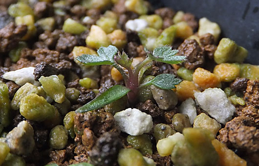 カシポオキナグサ(樫保翁草)の続報(その2)です。このところの湿度の高い天候に守られて、日ごとに逞しさを増しています。現在、本葉は4枚目まで出揃いました。発芽時点では根元付近の茎の太さは0.5mmほどしかありませんでしたが、現在は2mmほどになりました。とは言え、まだまだ自立できるスタミナは備わってないので、親の丸抱えの庇護が欠かせません。 2番手で発芽した弟分は現在2枚目の本葉が出たところで、ゴマ粒ほどの3枚目が出番を待っている段階です。更に、嬉しいことに3番手の発芽が確認できました、こちらはまだ2枚葉だけですが、梅雨明けまでには本葉が2-3枚まで出揃って、猛暑にも耐えられるスタミナを備えることだろうと期待しています。