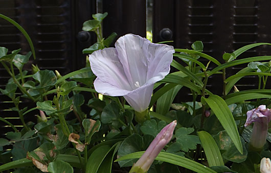 ハマヒルガオ(浜昼顔)が3-4日前から咲き始めました。1番花から開花は確認していたのですが、概ね8時ごろに見回りで見付けた時点で既に花は萎びており、この期間に撮影する機会は得られませんでした。上の画像も朝8時の時点でかなりお疲れの様子が見られましたが、これを逃すと撮影のチャンスはいつになるか分からないので、強制的にお顔のシワを少し伸ばしてエイヤっと撮影してしまいました。 さて、問題はその開花時間がいつなのか、さっぱり見当が付かないところです。昨年までは午前中に開花し、昼過ぎまではシャキッとしていたものですが、今年に関してはそのセオリーが成り立っていません。この数日で確認できていることは (1) その日に開花したものが、朝8時には既に萎れている。 (2) 日中から夕方(7時)に開花したものはない。海岸などに自生しているものは、正午を挟む数時間は見頃なのですが、この固体は我が家にやって来て3年経ち、すっかり性格が変わってしまったようです。何とか日中にシャキッとした姿を取り戻させたいものですが、さてどうしたものか・・・・