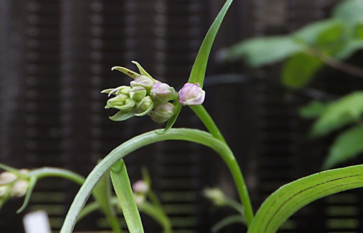 ウチョウラン(羽蝶蘭)のツボミが大きく膨らみ、開花が近付いて来たようです。あと4-5日といったところでしょうか。花付きも良好で、咲き揃えば賑やかな眺めが実現しそうです。 昨年2鉢増やして都合4鉢(品種)がツボミを膨らませつつあります。昨年リクルートしたものは、1芽か2芽と零細ですが、画像のように年季が入ったものは、分球するなどで株数が増えているのに加え、1株当りのツボミも多くなっています。自動潅水装置の導入が最も有効に働いた品種の一つで、1年後生存率は初期の60-70%から、最近は損失がなくなっただけでなく、むしろ増加する傾向が定着しつつあります。この品種の最大のメリットは、草丈が10cm前後で嵩張ることがなく、いくら増えても場所の心配が要らないという点です。