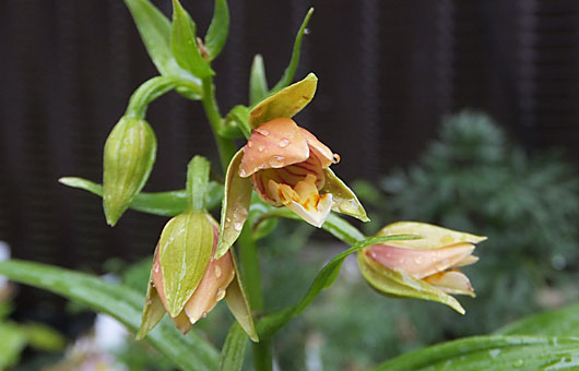 カキラン(柿蘭)が開花しました。派手な配色のものが多いランの仲間の中では、かなり地味で渋い色使いの花です。一昨日まで自動潅水の泣き所(=散水の谷間)でグッタリしていたのですが、手動の水遣りと、この地方が梅雨入りして19日目にして初めて降った雨に助けられて、少しだけ元気を取り戻しました。いずれの花も、何となく半開き状態で止まっていますが、天気とスタミナが回復すれば全開状態になるのではないかと思います。 先にも触れたように、雨の中での撮影になってしまいました。2年前黒部源流域徘徊の際、雨中の撮影を強行してレンズの駆動部が動かなくなったことを思い出し、少々ビビリながらの撮影になってしまいました。今のところ不具合は出ていませんが、問題は2週間ほど経って出るものなのでまだ安心はできません。