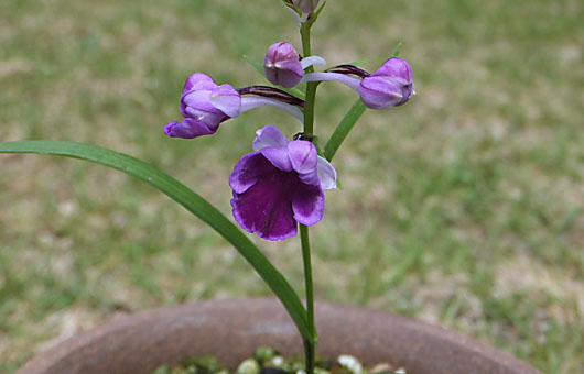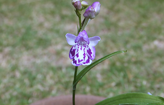 ウチョウラン(羽蝶蘭)が咲き始めました。取り敢えず昨日中に開花したのは1輪だけですが、一両日中には画像後方のツボミや、他の品種も続々と開花しそうな段階に入っています。特段の稀少品を保有している訳ではありませんが、向う2週間ほどは入れ替わり立ち代わりで咲き続けて、ささやかな楽しみをもたらしてくれそうです。 とは言え、この子たちが満開状態になったとしても、庭やベランダが華やぐほどのものではありません。草丈はせいぜい10cmから15cmで、どんなに咲き揃っても賑わうのは当該ポットの上だけの話・・というのが現実で、2mも離れると存在にも気付かないかもしれません。寂しい話になってしまいましたが、保護者としては精一杯ポットに通って、熱視線を送ってやろうと思います。