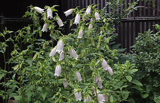 ホタルブクロ(蛍袋)が咲き進んできました。このところ大袈裟にいうと千成瓢箪状態で、常時20~30輪が顔を揃えて咲いています。いやー、なかなかの壮観です ^^。 豊穣な有機質の養分の助けもあって、草丈は90cmに達する勢いで、他の草花とは頭1つ、いや2つ(?)相当は抜けており、よく目立ちます。これといってきれいな花ではありませんが、子供の頃遊んだことを重ね合わせての懐古趣味で招き入れたものです。ただ、”増え過ぎ”の現実は覆い難く、花後に1/3~1/4に頭数(株数)を縮小するつもりです。リストラ対象となる株の一部は、近くの草むらに移植してやろう・・などと、またまた良からぬことを企んでいます。区役所のお役人に知れたら、こってり油を絞られるかもしれません。