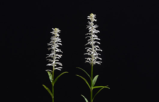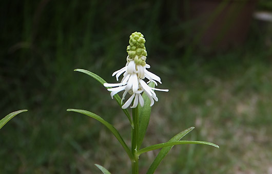 コシキジマシライトソウ(甑島白糸草)が咲き始めました。現在四分咲きといったところですが、週明け頃には満開になるのではないかと思います。画面左に葉っぱの先っぽだけが写っていますが、この先に花穂がもう1芽控えています。そちらは少し遅れていて、まだ二分咲きといったところです。両者合わせて、来週一杯が見頃になりそうです。 ツボミの時には、個々の花は一見パンチパーマのように固く巻き込まれています。こんな状態で自然に解れて花になるのか・・と思わせる造りですが、そこは上手くしたもので、淡い緑だったツボミが白く変わり、膨らみを増すに従い器用に花弁を解して来ました。機材が整っていれば、この変化の様子を連続画像に収めてみたいところですが、今の我が家の保有機材ではどうにもなりません。次のシーズンまでに必要な機材のリサーチを進め、コスト面で折り合うようならトライしてみようと思います。
