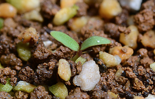 一昨日紹介したカシポオキナグサ(樫保翁草)の続報です。新顔No.2が顔を出しました。いささか大袈裟ですが、気分としては祝砲を上げたいところですが、長屋生活者としてはそうもいかないので、ささやかに祝杯で済ませてしまいました ^^。 さて本題の新顔ですが、冬の間の強風で用土がポットの風下側に吹き寄せられていたものを、均等に均そうとしていて気が付いたものです。ならば後に続くものはないか・・と、ついつい欲を出して見回してみましたがそれは空しい努力に終り、代わりに腐敗した種子の残骸が見つかっただけでした。そんな訳で、恐らく画像の固体が最終ランナーになりそうな雰囲気なので、ここで一旦〆ておくと、発芽率は僅かに2/9(22%)という低率にとどまりました。僅かに2芽で猛暑の夏を乗り切るのは大変そうですが、少しでも涼しい環境を探すなど、延命策の追求を続けて行くことにします。
