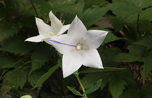 早々の吉兆です。1週間前に1番花が開花したばかりのアポイギキョウ2番花に、紫の絞り模様が出ました。もしかすると今年は絞り咲きや、白と紫の乱れ咲き(注:ここでは1つの茎に色違いの花が付く状態を指します)の発生確率が高まるかも・・などと、早々と捕らぬタヌキの皮算用が始まりました。いやはやお恥ずかしい話で・・・ そもそもこの品種は「絞り咲き」という謳い文句に釣られて種子を購入したものでした。種蒔きから2年目には初花を見ましたが、初年度は白花ばかりで、少なからず落胆したものです。2年目には白花に混じって紫花が咲くようになり、更に3年目になって初めて絞り咲きが実現しました。ただ、こうした変わり花の発生頻度は初期は微々たるものでした。年を重ねるに連れて頻度は高まる傾向が見られましたが、昨年までは白花が2-30輪咲き進んだ頃、やっと顔を見せる・・といった程度でした。それが今年は2輪目でこれです。保護者の期待は膨らむ一方で、いささか暴走ぎみです。