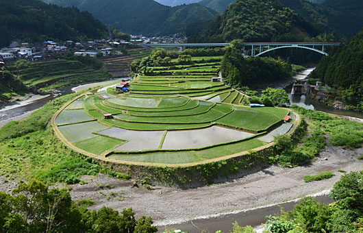 ずっと前から憧れて(?)いた、和歌山県有田川町の蘭島(あらぎじま)の棚田(日本の棚田百選の1つ)を見物して来ました。アユ釣りのメッカとして知られた有田川沿いに国道を遡り・・・という予定で出掛けたのですが、有田ICの少し手前で発生した事故で渋滞していため、1つ前海南ICで降りて山越えの迂回路を選択したのですが、結果的に時間の節約になったかどうかは自信がありません。何はともあれ現場・清水地区には無事到着、川が大きく蛇行したところにその棚田はドーンと異彩を放っていました。 扇形に区割りされた水田は田植えが終わったところで、水と緑が美しく映えています。対岸の展望所には、観客は最初は私一人で、貸切状態で自由に行動できました。30分ほど経った頃に、入れ替わるように1人、また1人と観客が訪れるようになりましたが、この日に関しては至ってのんびりと行動できました。因みに、展望所の近くに車を止めることはできない(注:身障者用駐車場が1台分だけ設けられています)ため、現場から200mほど手前の公民館の駐車場を利用させて戴きました。 この先、この地には何度か通うことになりそうです。取り敢えず今想定しているのは、(1)穂が出始める前、(2)稲穂が色付いた頃、(3)取入れが終わった頃・・などですが、ここの外に「一見の価値あり」の丸山千枚田(三重県)もあり、そちらにも食指が伸びそうになっています ^^。