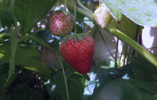 JAや道の駅の即売コーナーからイチゴはすっかり姿を消してしまったこの頃ですが、我が家のプチ菜園のイチゴ(女峰)は、何を勘違いしたか今になって実を付け始めました。とは言え、既にメインイベントは5月に終了しており、今頃目を覚まして起き上がって来たのは僅かに2房、10粒足らずです。 メインイベントでは熟した実の大半を曲者どもに食われてしまいました。全ての正体が分かった訳ではありませんが、一例として実を食った跡の空洞に住み着いてダンゴになっている状態を目撃するなど、ダンゴ虫が一定の悪事を担っていることは疑いがありません。今回の2度目の結実では何としても、こうした曲者どもを撃退したいものなのですが、ダンゴムシに対して有効な駆除剤はまだ入手できていません。
