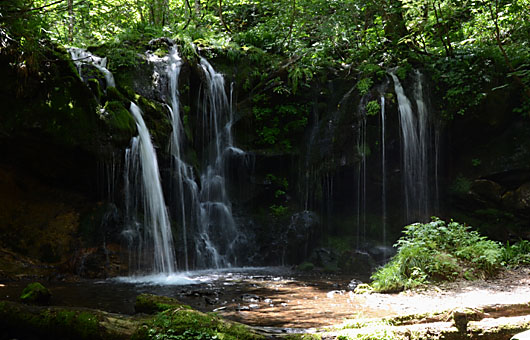 大半の学校が夏休みに入った昨日、西日本は暑い1日になったようです。「・・・ようです」などと、他人事のように書いてしまったのは、人里を逃げ出して滝巡りに出掛けて、正午を挟む時間帯を涼しく過して来たためです。 今回出掛けたのは兵庫県新温泉町の山中、標高900m付近にある「猿壷(さるぼ)の滝」です。国道9号が兵庫から鳥取に県境をくぐる2kmほど前で左(=南)に折れ、10kmほど山中に分け入ります。道幅は最初のうちは国道と変わらないほどですが、次第に狭くなり10kmのうち6~7kmは簡易舗装はされているものの、すれ違いもできないような狭さです。現地には10台ほど止められる駐車場が設けられており、そこから徒歩3-4分で目指す滝に着きます。 残念ながら時期的に減水期にあり、ご覧の通り滝の流れは「ショボ!」判定しか下せない状態でした。行き先選定に当たり参考にした写真は、水量はこの3倍ほどあるもので、いつか適度な雨の後リベンジに出掛ける気になっています。とはいうものの、迫力のある画像をゲットするには水量が必要ですが、アクセスルートには渡渉箇所が2箇所あり、水量に比例して危険度が増す・・というジレンマがあります。何はともあれ、現場の空気はヒンヤリして、暫し里の暑さを忘れることができました。