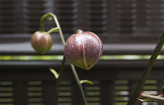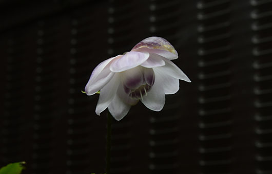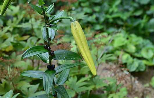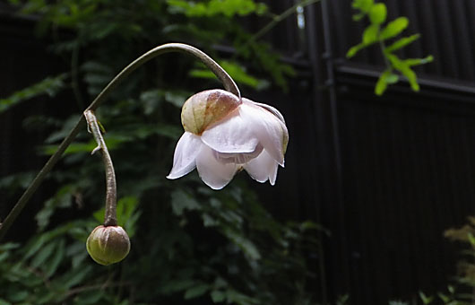 レンゲショウマ(蓮華升麻)の露払いというか、斥候役(?)が開花しました。ここ何年か見られるようになった、本隊到着に1ヶ月ほど先行して1輪だけ咲くものです。昨年はかなり歪な形で咲きましたが、今年のは色も形もこれといった欠点のない、ごくまともな出来栄えです。 とはいうものの斥候役の辛いところで、後に続くものは当分ありません。準備が始まったツボミも、今は大きいものでも大豆粒ぐらいしかなく、これら本隊の開花が始まるのは今月下旬です。昨年までは開花可能な株は1株だけでしたが、今年は株分けしたものが2株増えました。それらを合わせると、今年は軽く50輪を超える花が見られそうな勢いです。