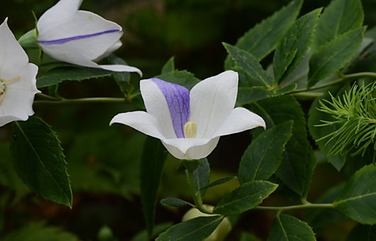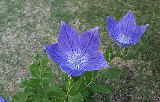 アポイギキョウの絞り咲き2号開花です。左後方に写っているのが同1号で、混色の面積比率は少しアップしています。これまで開花したのは合計4輪で、うち2輪が絞り咲きでした。たまたま集中しただけかもしれませんが、打率5割は上出来といえます。その内にスランプもあるだろうし、そこそこの数値に落ち込むのでしょうが、まずは絶好のスタートを切ったようです。 こうした変わった咲き方にとり憑かれて、この品種については長い間増えるに任せていました。キキョウの仲間にありがちなことですが、一旦居心地いい場所に根を下ろすと、猛烈な勢いで増殖し始めます。この花の種子は微小な粉末様のものなので、いつの間にか飛散してあっちこっちに芽を出すようになります。いま我が家はそうした状況になり始めており、芝生、他のポットと場所を選ばず根付きつつあります。昨年秋には20株余りを処分したのですが、現在はそれを上回って増えています。この品種でも増殖と駆除の、際限のないイタチごっこが始まってしまいました。