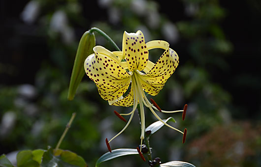 オウゴンオニユリ(黄金鬼百合)が開花しました。昨日は法事で家を空け、帰宅したのが夕方になってしまいました。日差しがなくなってからの撮影になってしまったため色調に冴えがありませんが、日差しを受けた時の色合いは黄金色に見えなくもありません。保存用の画像は今日にもリトライすることにします。 今週後半には背後に控えているツボミも開花することになると思いますが、今年はこの2輪だけで営業終了になります。他の草花ポット、プランタに寄生したり、プチ花壇に根を下ろした株が開花適齢に達する来年には、花の数は激増する筈ですが、その後はこの草の生命力と、抑制を目論む私の果てしない根競べが始まることになります。