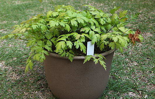 時期としては甚だよろしくないのは承知の上で、過密ぶりが目に余るセリバオウレン(芹葉黄連)を植え替えることにしました。この6号プラ鉢には、実生2年目のものが13株植わっています。葉柄は隣の隣まで伸びて、もつれ合うように繁茂しています。植替えに伴うストレスや、根のダメージは少なくないのは承知の上での決行です。 プラ鉢から掘り上げてみると、予想通り根は団子状に絡み合っていました。竹串でほぐしながら1株ずつ取り分けるのですが、少しでもヒゲ根の断裂を減らすよう慎重に作業した結果、30分余りの時間をかけてしまいました。新居は7号陶鉢1点と5号陶鉢2点です。下の画像が植え替えた後の様子ですが、左の5号鉢に4株、中央の7号鉢には7株、右の5号鉢には別のポットからの1株と合わせて3株を植え付けました。手間をかけて注意深く掘り上げたとはいえ、根には少なからぬストレスだったことと思われます。当分は強烈な日差しを避けて、建屋北側の涼しい場所で養生させることにします。