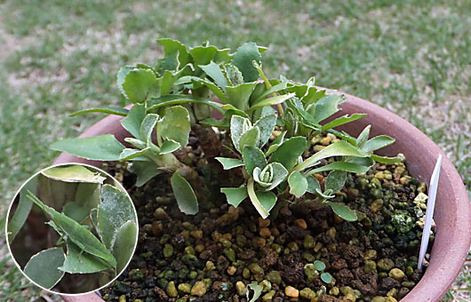プリムラ・マルギナータが半月ほど前から葉っぱが減り始めたのに気付き、何者の犯行かと気にしていたのですが、特段の毛虫がいる訳でもなく、犯人を特定できないまま被害は拡大していました。昨日になって犯行現場を押さえることができ、ショウリョウバッタの子供(?)の犯行であることがはっきりしました。体長は1cmを少し超える程度の固体ですが、時間さえかければ大変な量を平らげるものだと、関心したり、悔しがったりのジレンマに陥ってしまいました。 梅雨の終わり頃には、上から見ると5号陶鉢一杯に葉を広げていて、用土は一部しか見られない状態に繁茂していました。それが今ではスケスケになってしまい、株元の枝分かれの様子も見通せるようになってしまいました。サクラソウの仲間でありながら常緑型のこの品種は、真冬でもこんなに葉を減らしたことはありませんでした。常駐型の毛虫ばかりを疑い、通勤(?)型のバッタの仲間に意識が向かなかったのが、今回の被害が拡大した原因になりました。秋までに葉っぱの賑わいを回復できるか気になるところです。因みに駆除方法については至極簡単で、キ○チョール一吹きで曲者は静かになりました。