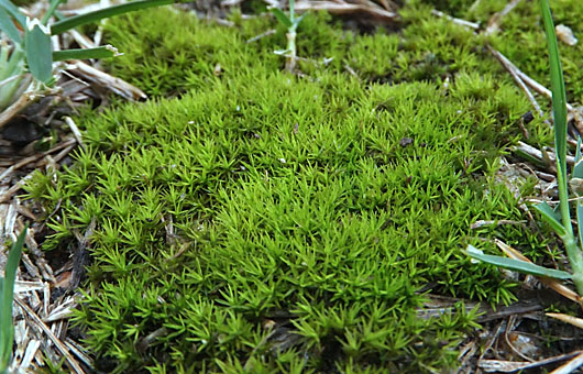 一昨日昼までは乾いて黄色っぽくなっていたコケ(種別不詳)が、一昨日、昨日と通過した夕立で一気に生気を取り戻したようです。生えている範囲は各種カードサイズのごくごく小規模なものですが、このような小群落が数箇所確認できます。昨年は1箇所だけだったことを思うと、足取りは速いとは言えませんが着実にテリトリーを広げているようです。 この子たちが住み着く前はゼニゴケの独り舞台だったのですが、このところ小庭のゼニゴケは影を潜めています。とは言え、ポットやプランタに着生するのは専らゼニゴケで、今も油断できないという状況に変わりはありません。そうしたゼニゴケに対して、種別は分からないながら画像のタイプならいくら繁殖しても不都合はありません。いっそのこと、芝生がすっかりこの子たちに置き換わっても不満はないのですが、乾燥の激しいこの地域では実現の見込みはほとんどありません。